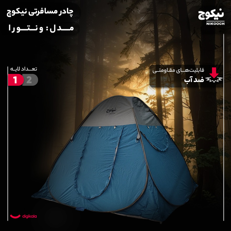 چادر مسافرتی ۸ نفره نیکوچ مدل ونتورا با طراحی مقاوم و حرفهای، گزینهای مناسب برای طبیعتگردی و کمپینگهای گروهی است. این چادر با ابعاد کف ۲.۵×۲.۵ متر و ارتفاع ۲۱۰ سانتیمتر، فضای کافی برای نشستن ۸ نفر و خوابیدن راحت ۴ نفر به همراه وسایل را فراهم میکند. ساختار پایدار آن به کمک فنرهای قوی و الیاف ضخیم ابریشمی شکل گرفته و در برابر باد و شرایط سخت جوی مقاومت بالایی دارد. وجود ۸ عدد طوفانگیر و حلقههای فلزی مقاوم نیز استحکام چادر را افزایش میدهد. درب اصلی و پنجرهها دارای سرزیپهای فلزی دوطرفه هستند که علاوه بر دوام، باز و بسته شدن آسان را ممکن میسازند. همچنین پشهبندها گردش هوای مناسب و کاهش تعریق داخل چادر را تضمین میکنند. این محصول از برزنت ضخیم و ضدآب برنو ساخته شده و کف ضدآب همراه با سقف دولایه، محافظت کامل در برابر باران ایجاد میکند. نصب و جمعکردن سریع و آسان، این چادر را به انتخابی عالی برای سفرهای خانوادگی و کمپینگ ماجراجویانه تبدیل کرده است.