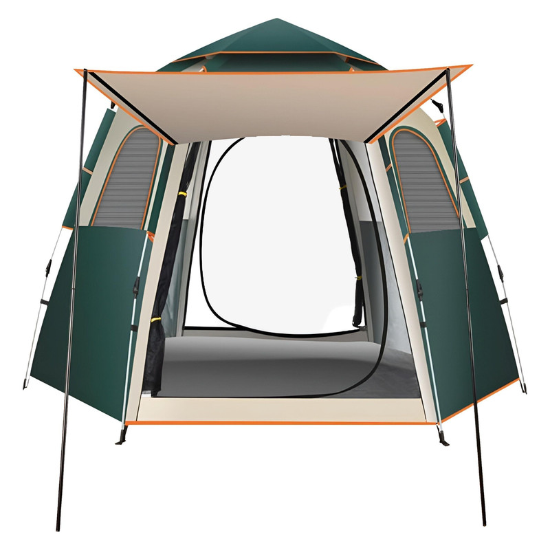 چادر اتوماتیک کمپینگ پروکمپ(procamp) مدل JH-8206-5 ، ماجراجویی های کمپینگ را راحت تر و دلپذیر تر می کند. این محصول تغییر دهنده شیوه برپایی چادر کمپینگ در سهولت و کارایی است. این چادر که هم برای کمپینگهای باتجربه و هم برای تازه واردان طراحی شده است، راحتی، دوام و راحتی بینظیری را برای تمام گردشهای شما در فضای باز ارائه میدهد. این محصول که به شکل یک شش ضلعی طراحی شده به دلیل ویژگی تنظیم خودکار خود که به چادر اتوماتیک معروف شده مزیت خوبی دارد که به شما امکان می دهد در چند ثانیه چادر خود را برپا کرده و یا جمع کنید. چادر با طراحی پاپ آپ(pop up) مبتکرانه خود، تقریباً فوراً به شکل چادر در می آید و زحمت مونتاژ چادرهای سنتی را از بین می برد. فضای سخاوتمندانه ای در این مدل چادر سفری برای جای دادن راحت تر افراد ارائه می شود. طراحی خوب آن شامل فضای سر زیاد و فضای داخلی جادار است که تجربه ای راحت را حتی در سفرهای طولانی تضمین می کند. این چادر دارای دو پنجره مشبک بزرگ و منافذ تهویه برای افزایش جریان هوا است ، دو در نیز که هر دو دارای سایبان هستند نیز در دو طرف دیگر تعبیه شده و فضای داخلی را حتی در شب های گرم، خنک و تازه نگه می داردو از این رو برای سه فصل مناسب است. لازم بذکر است که همه در ها و پنجره ها دارای توری پشه بند با زیپ جدا و محل جمع شدن جدا از روکش در و پنجره هستند. چادر کمپینگ پرو کمپ مدل JH-8206-5 با مواد با کیفیت، برای مقاومت در برابر عناصر طبیعی ساخته شده است. این چادر دارای یک پوشش مقاوم و ضد آب با پارچه 210D آکسفورد است و همچنین یک کف بادوام و مقاوم در برابر آب که محافظت قابل اعتمادی در برابر باران، باد و رطوبت دارد.استاندارد ضد آب آن PU2000mm گزارش شده است. میله های قوی و مستحکم و درزهای تقویت شده در مقابل نفوذ آب به دوام کلی آن کمک می کند و اطمینان حاصل می کند که چادر در شرایط مختلف آب و هوایی عملکرد خوبی دارد. ابعاد این چادر ۱۵۸×۲۸۰×۲۸۰ سانتی متر بوده که در دو طرف آن سایبان با ابعاد ۱۳۰×۱۴۰ سانتی متر هم برپا می شود که کارایی آن را دوچندان می کند. چادر کمپینگ اتوماتیک پروکمپ مدل JH-8206-5 با راه اندازی سریع و آسان، طراحی جادار و محافظت قابل اعتماد در برابر آب و باد، تجربه ای بدون دردسر و لذت بخش در فضای باز را تضمین می کند.