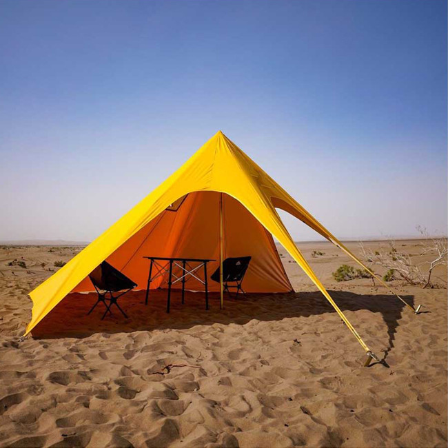 مینی استارتنت مدل ادونچر یک سایبان ستارهای کوچک، کم حجم و کاربردی با فضای سایه زیاد برای ۸ الی ۱۰ نفر است. این سایبان دارای عایق نسوز است و از آنجایی که پارچه آن ضدآب است علاوه بر استفاده در فصل تابستان به عنوان یک سایبان، میتوانید در فصل زمستان در هوای بارانی و برفی زیر آن از بخاری هیزمی استفاده کنید و دودکش آن را از قسمت عایق نسوز رد نمایید. به دلیل اینکه سه طرف این سایبان کاملا بسته است می توانید طرف بسته را رو به خورشید قرار دهید تا بیشترین فضای سایه را داشته باشید. جنس میخ های این سایبان از فولاد ck۴۵ است که مقاومت بالایی در برابر خم شدگی دارد و برای زمین های سنگلاخی و جنگلی مناسب است. چنانچه قصد استفاده از این سایبان، در ساحل یا کویر را دارید، باید میخ های مخصوص کویر را جداگانه خریداری کنید. محلقات:دارای ۹ عدد میخ ۲۵ سانتی متری با ضخامت ۱۰mm مناسب زمین های سفت و سنگلاخی, دارای میله مرکزی, دارای عایق نسوز برای رد کردن دودکش بخاری هیزمی است.