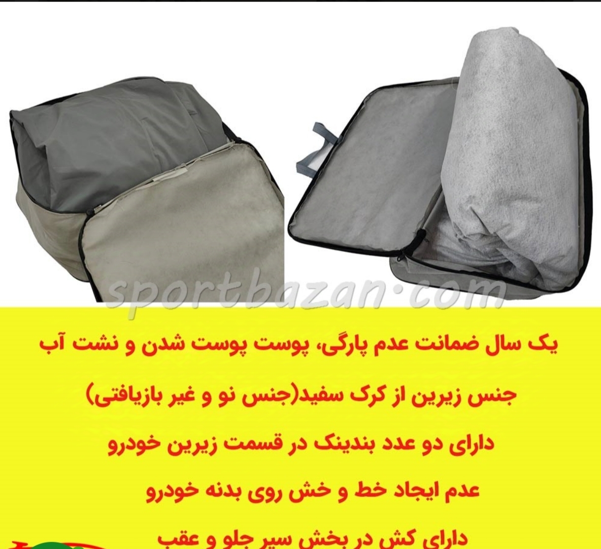 دارای دو عدد بندینک در قسمت زیرین خودرو, دارای کش در بخش سپر جلو و عقب, یک سال ضمانت عدم پارگی، پوست پوست شدن و نشت آب