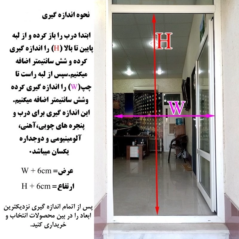 مشخصات : 1: استفاده از نایلون ایرانی با ضخامت 0.25 میکرون, 2: استفاده از آهنربا به صورت طرح یکسره , 3: استفاده از 3 الی4 عدد چسب دو طرفه 15 سانت در سمت راست و چپ پرده و چسب 5 سانتی یکسره در بالای پرده