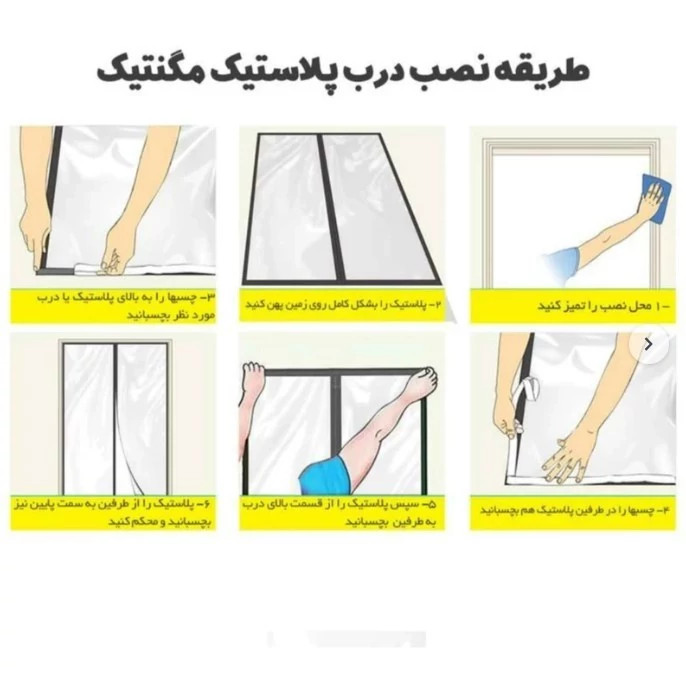 نکته 2: در ابتدا چسبک های مشکی رنگ موجود در داخل پک را به خود پرده متصل کنید و سپس روکش زرد رنگ چسب پهن یکسره بالا ی پرده را جدا سازی کرده و در بالای درب متصل کنید(لطفا دقت کنید که پرده را در ارتفاعی نصب کنید که پایین پرده به هیچ عنوان با زمین برخوردی نداشته باشد, در غیر این صورت آهنربا ها عملکرد خوبی نخواهند داشت) در صورتیکه به تنهایی نمیتوانید نصب کنید میتوانید از یک نفر کمک بخواهید.