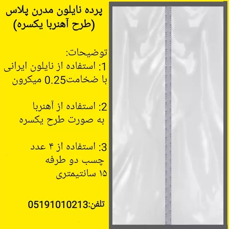 مشخصات : 1: استفاده از نایلون ایرانی با ضخامت 0.25 میکرون, 2: استفاده از آهنربا به صورت طرح یکسره , 3: استفاده از 3 الی4 عدد چسب دو طرفه 15 سانت در سمت راست و چپ پرده و چسب 5 سانتی یکسره در بالای پرده