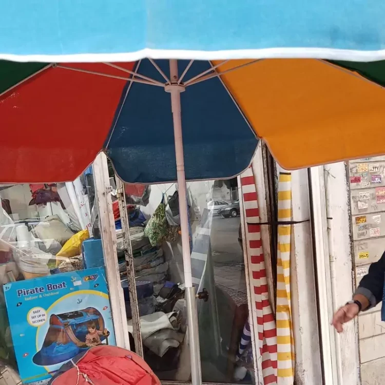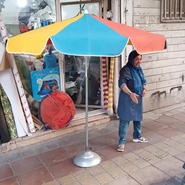 چتر سایبان از جنس برزنت سایه آن بسیار خنک میباشد ضد آب نیست و برزنتی مناسب آفتاب است دارای یک لوله برای تنظیم ارتفاع و یک پایه برای ایستادن کف زمین است تا شو بوده و در صندوق ماشین قابل حمل است