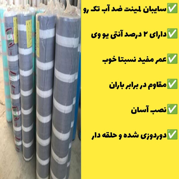 ✅سایبان لمینت ضد آب تک رو ✅دارای ۲ درصد آنتی یو وی ✅عمر مفید نسبتا خوب✅سایبان لمینت ضد آب تک رو ✅دارای ۲ درصد آنتی یو وی ✅عمر مفید نسبتا خوب ✅مقاوم در برابر باران ✅نصب آسان ✅دوردوزی شده و حلقه دار ✅مقاوم در برابر باران و برف ✅نصب آسان ✅دوردوزی شده و حلقه دار
