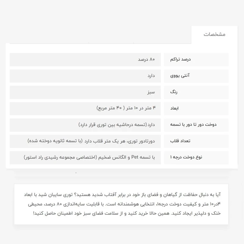 توری سایبان شید، 4در10، دوخت درجه1، 80درصد